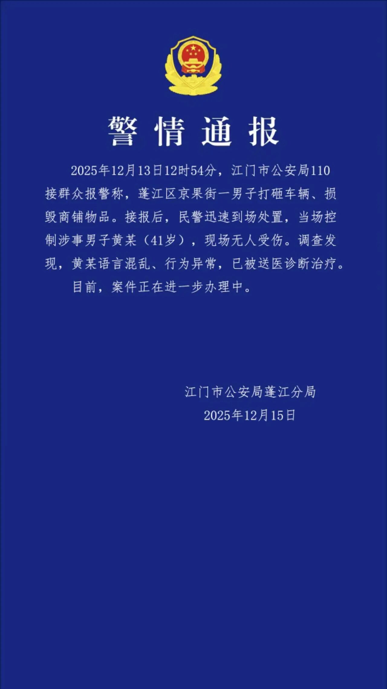中国网12月16日讯12月15日,广东省江门市公安局蓬江分局发布警情通报:12月13日12时54分,江门市公安局110接群众报警称,蓬江区京果街一男子打砸车辆、损毁商铺物品。接报后,民警迅速到场处置,当场控制涉事男子黄某(41岁),现场无人受伤。调查发现,黄某语言混乱、行为异常,已被送医诊断治疗。目前,案件正在进一步办理中。