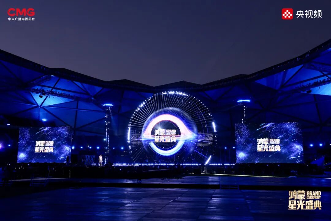 盛典以“鸿蒙初开,星河互联”为理念,打造出一座兼具东方哲学意蕴与未来科技感的舞台。象征“天”的曲面球体如星辰初开,寓意鸿蒙系统凝聚万物;象征“地”的水景舞台包容万象,两侧镜面副屏延伸出无限可能的数字世界。舞台本身也是技术的突破——历经8天极限搭建,3065块曲面屏无缝拼接,攻克结构与曲率的双重挑战;8组灯光塔构筑起立体的“光宇宙”,书写万物互联的科技诗篇。在节目效果呈现上,盛典将AR、AI等前沿技术深度融合,打破物理与虚拟的界限,传递科技温度。